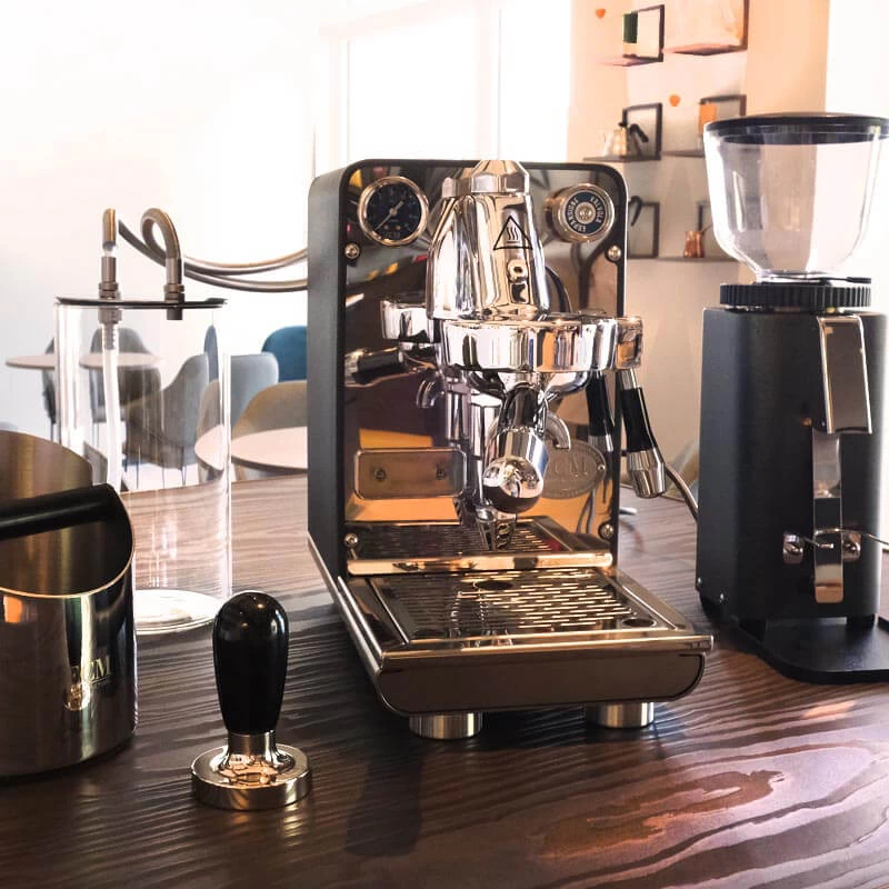 - Vollausstattung von ECM mit Siebträgermaschine, Kaffeemühle, Tamper und Knockbox