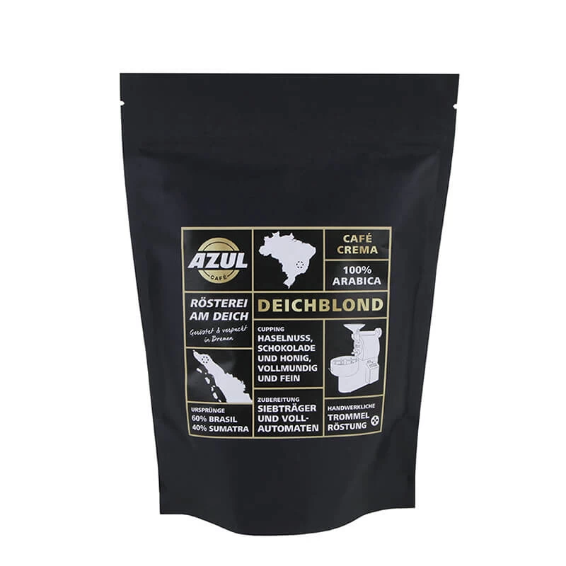 Die Deichblond Mischung der Azul Rösterei besteht zu 60% aus brasilianischen Arabicas und zu 40% aus Arabicas aus Sumatra. Die hell gerösteten Bohnen des Signature Blends der Rösterei am Deich verleihen dem ausgewogenen Ergebnis in der Tasse viel Körper und eine feine Eleganz. Begleitet wird dieses Geschmackserlebnis von Noten nach Haselnuss und Schokolade mit Anklängen von Honigsüße.