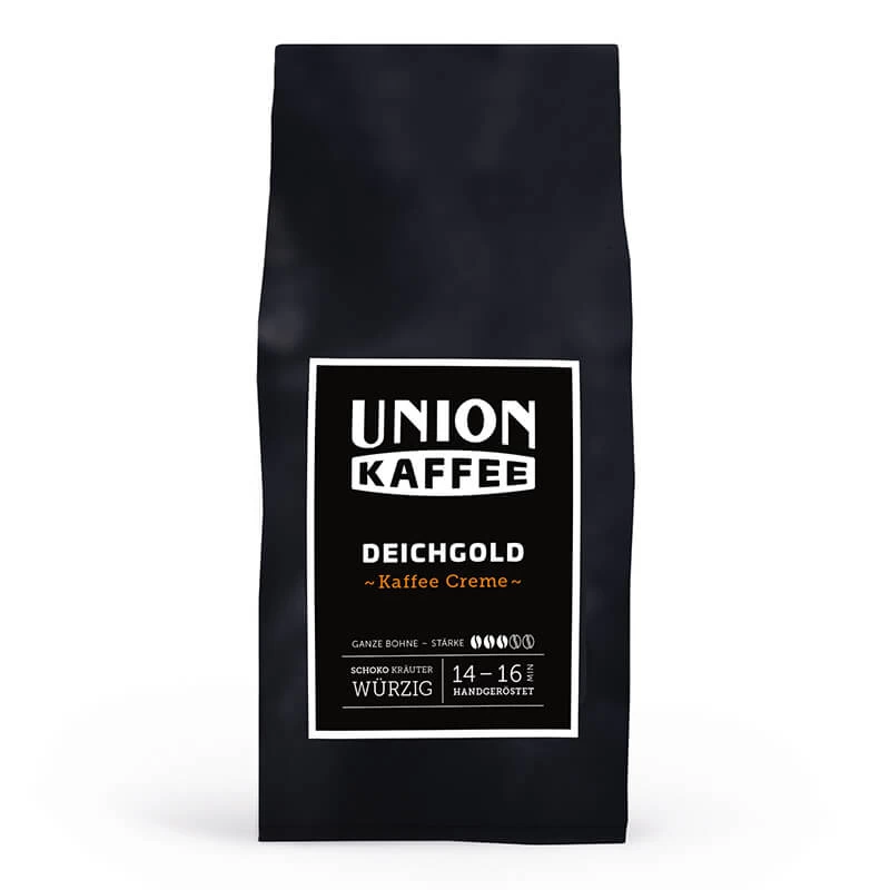 Der Blend Deichgold von Union Kaffee besteht zu 100 % aus Arabica Bohnen. Die Bohnen haben ihren Ursprung in drei Ländern: Brasilien, Kolumbien und Sumatra. Der Körper ist voll und die Crema schön üppig. Geschmacklich zeichnet sich der Blend durch Noten von Schokolade aus, der Nachgeschmack hat zudem Nuancen von Gewürzen.