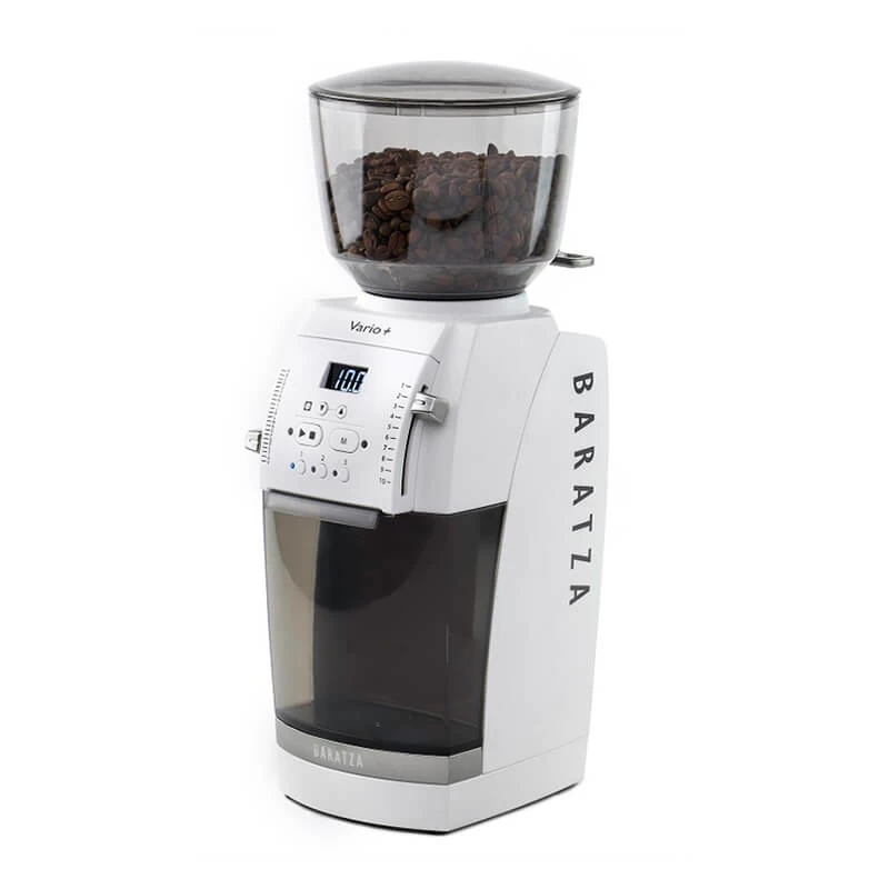 Die beliebte Kaffeemühle von Baratza hat mit der Vario+ Version eine verbesserte Variante erhalten. Vorher als „Mahlkönig Vario“ vertrieben, kommt diese nun als Vario+ Modell auf den Markt. Unverzichtbare Kaffeemühle mit vielen Features. Zu den verbesserten Komponenten gehört unter anderem der Bohnenbehälter aus der Forté-Reihe, dieser besitzt einen Schließmechanismus. Die Vario+ besticht durch das qualitative Mahlergebnis. Das Bedienfeld und Display hat ebenso einen verbesserten Look. Ein Hingucker ist zudem die strahlende LED-Beleuchtung am Auswurfbereich. Variablen bietet die Baratza Vario+ mit den Möglichkeiten, entweder den mitgelieferten Behälter zu nutzen, dieser kann unter den Auswurf eingesetzt werden. Oder aber der integrierte Siebträgerhalter mit Blende kann genutzt werden. Eine Kaffeemühle mit vielen Möglichkeiten.